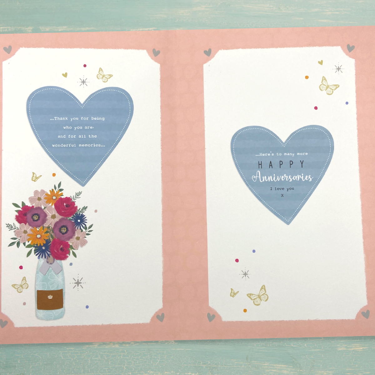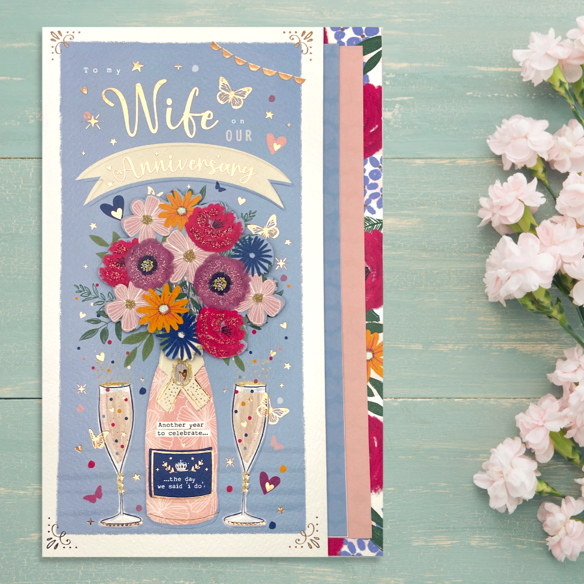 Gorgeous textured effect Wife Anniversary large card with decoupage embellishments. Finished with rose gold foiled accents and double page colour printed insert.