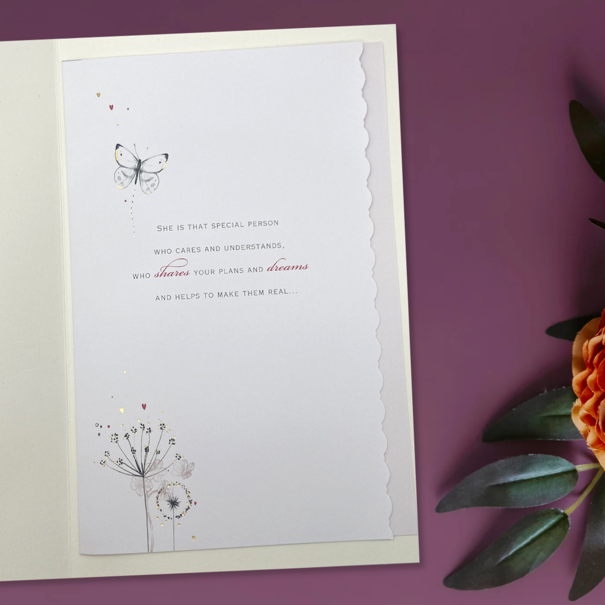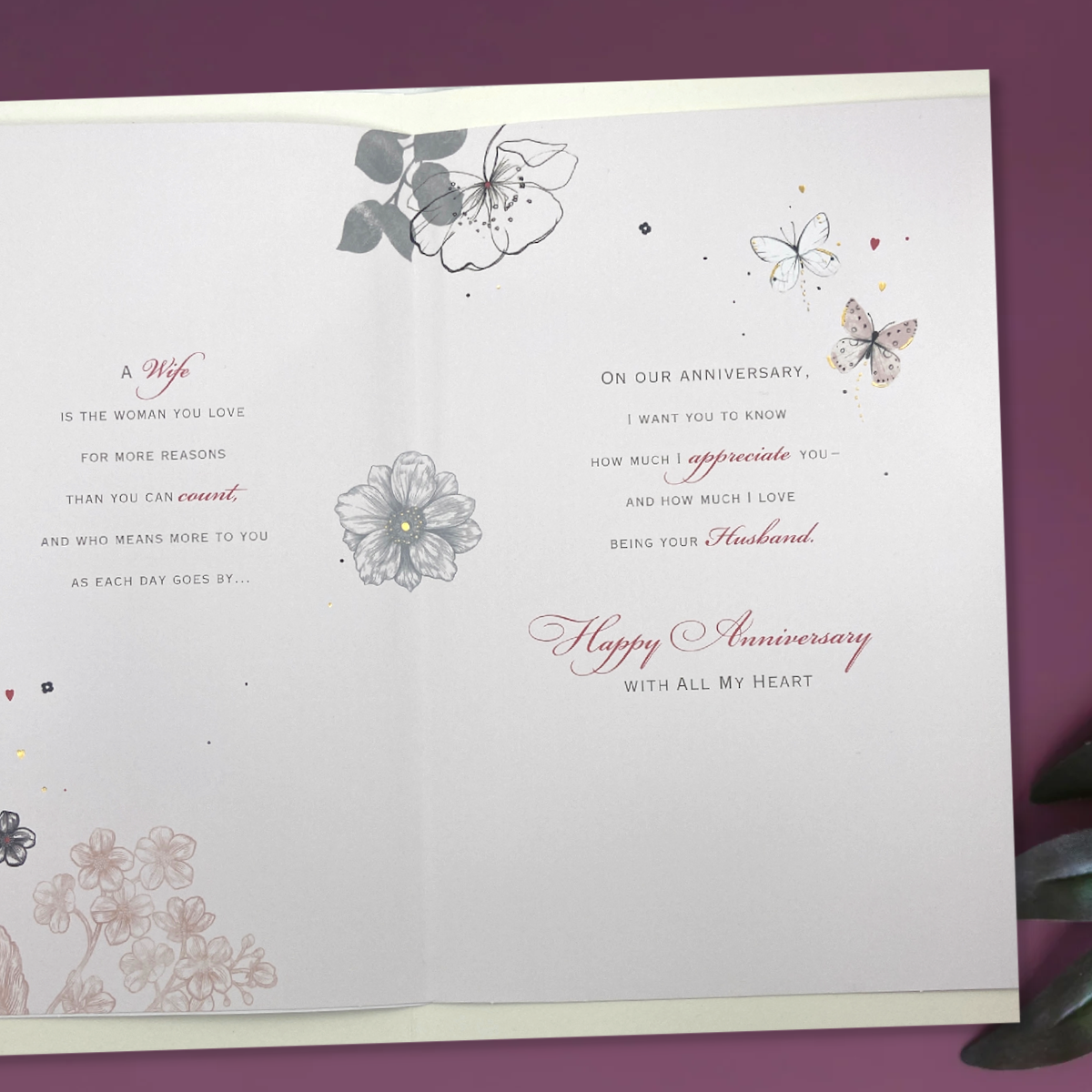 Stunning Wife Anniversary large card with quilted effect and decoupage butterflies. Finished with red and gold foil accents and beautiful double page colour printed insert.