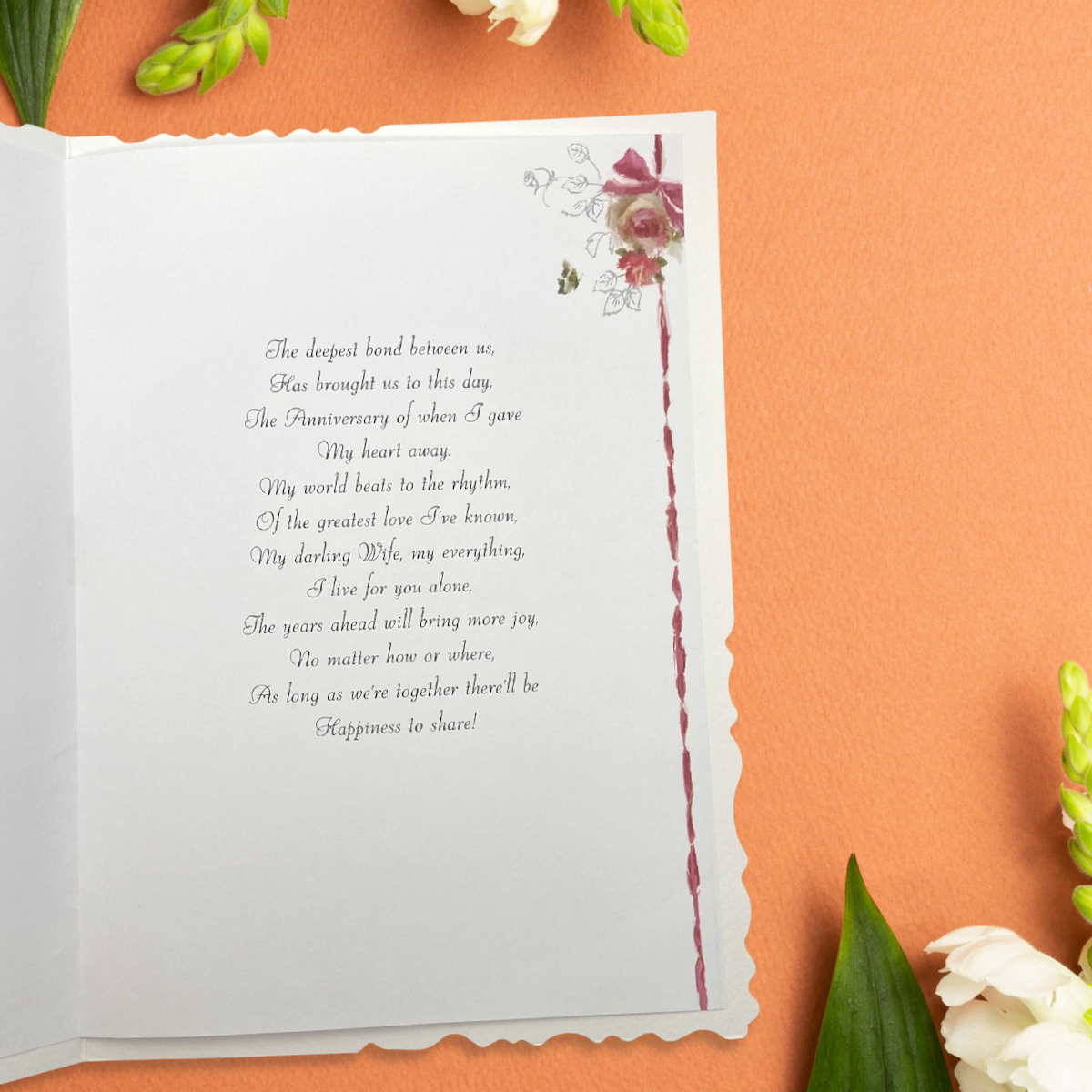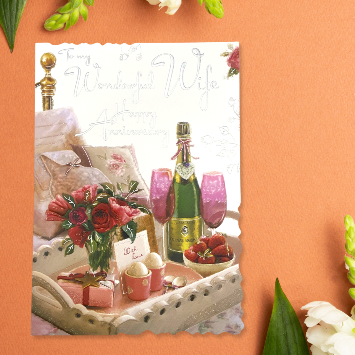 Fabulous Wife Anniversary large card from the Velvet collection with silver foil accents and added sparkle. Finished with die-cut edge, colour printed insert and heartfelt verse.
