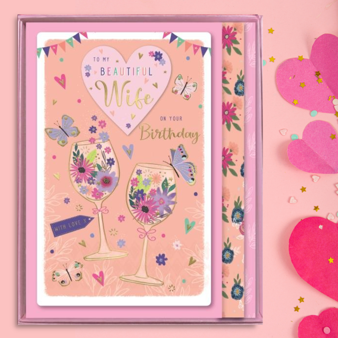 Wife Birthday Card - Boxed Butterflies & Hearts