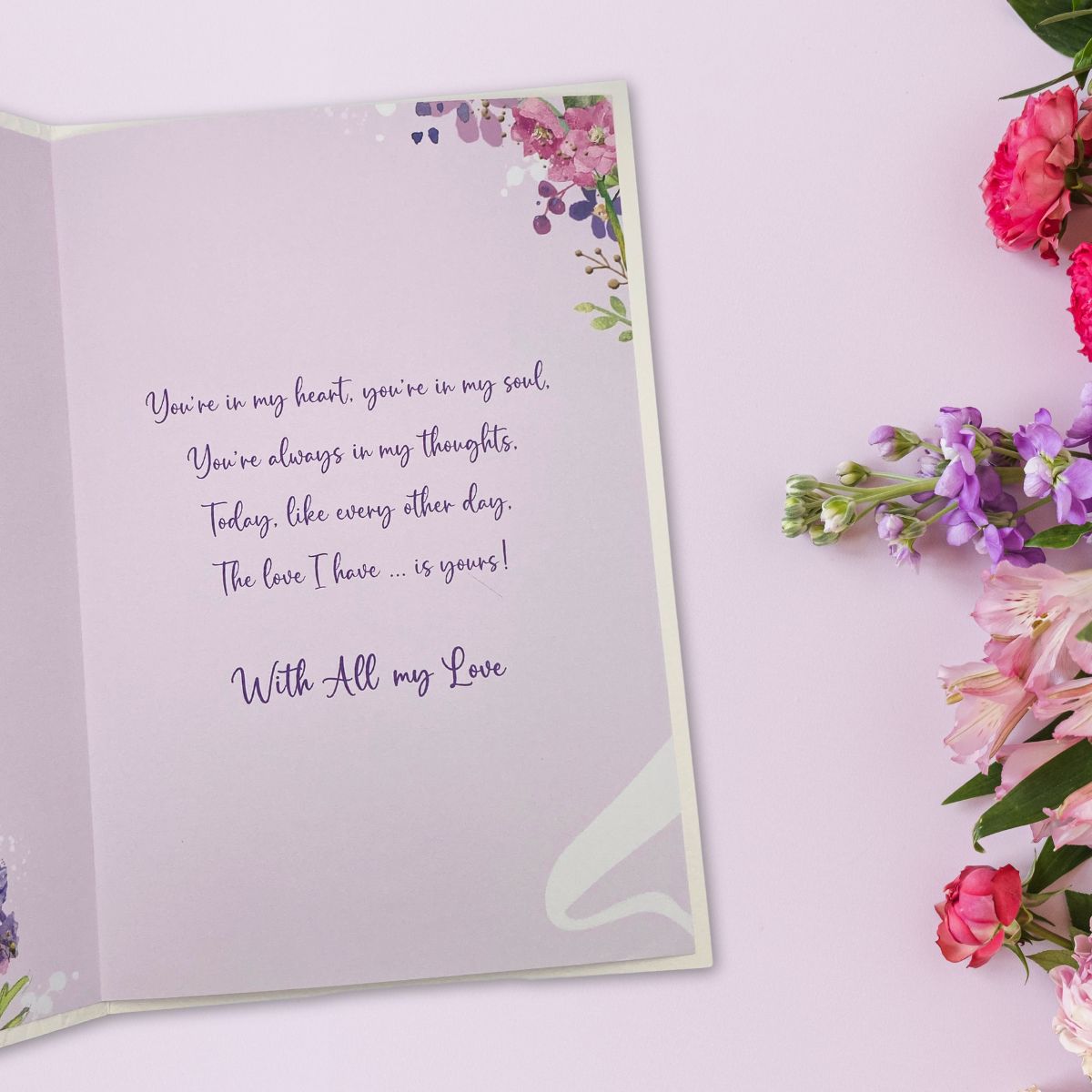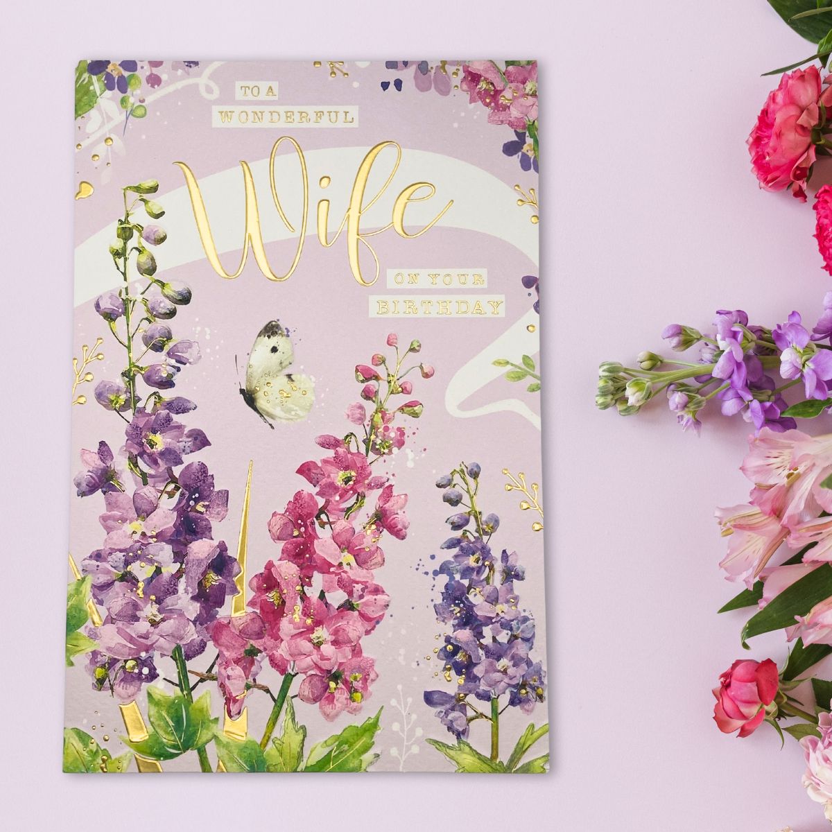 Fabulous Wife Birthday textured design from the Blossom collection with gold foil details and the prettiest colour printed insert.