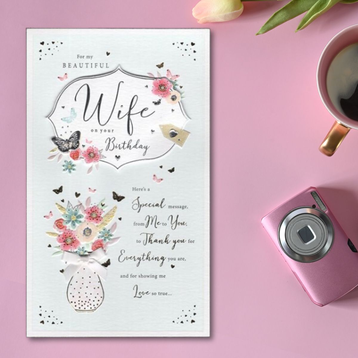 Stunning full colour Wife Birthday card complete with gold foiled lettering and full colour printed insert.
