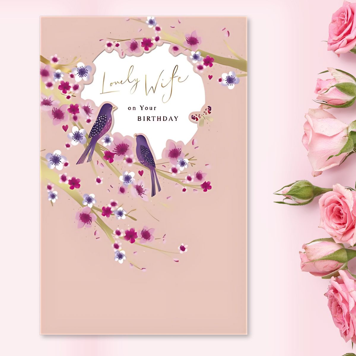 Wife Birthday Card - 3-Fold Purple Birds & Blossom