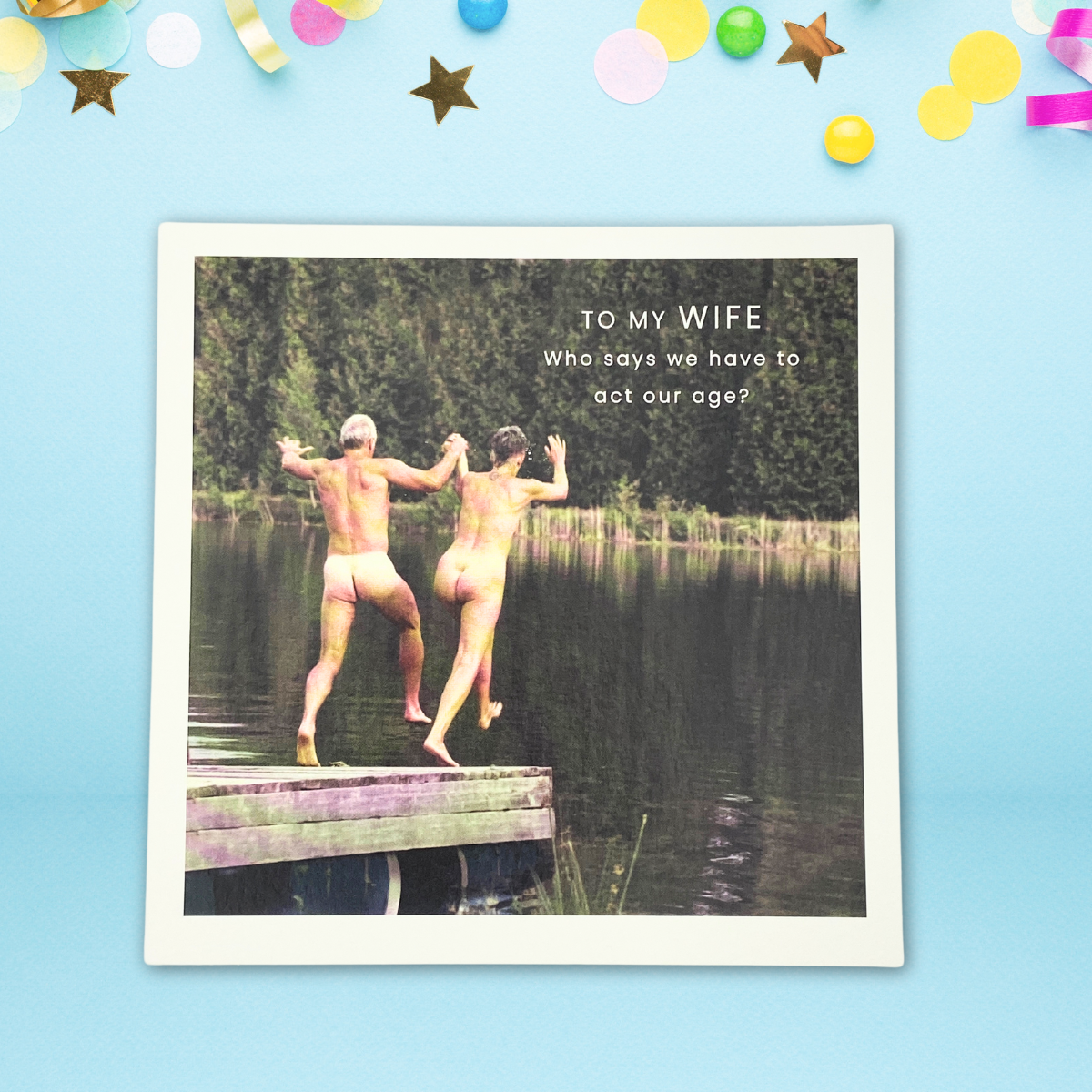 Funny Wife Birthday design from the UKG collection featuring a married couple naked jumping off jetty!