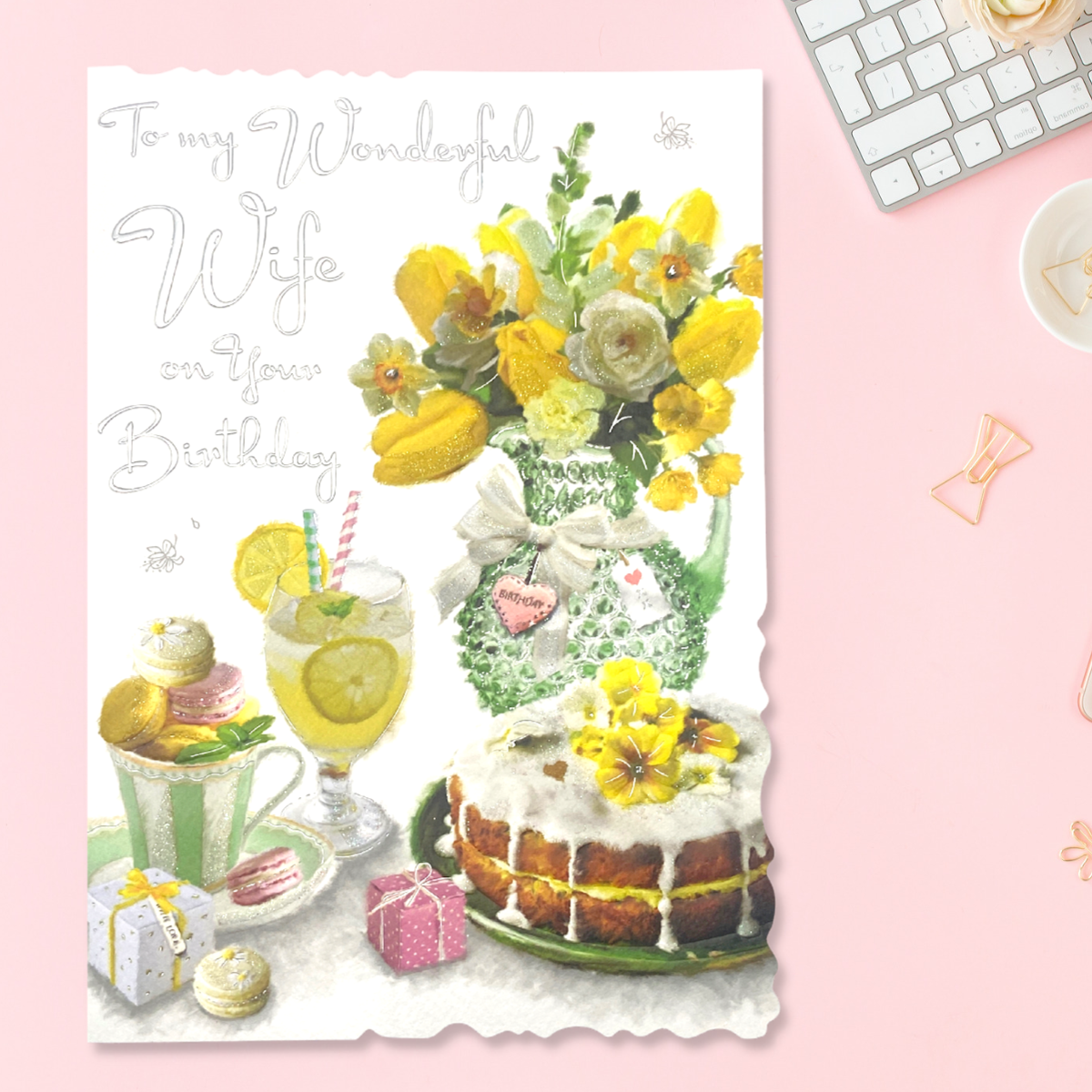 Gorgeous Wife Birthday large design from the Velvet collection with die-cut edge, silver foil details and added sparkle. Finished with colour printed insert and heartfelt sentiments.