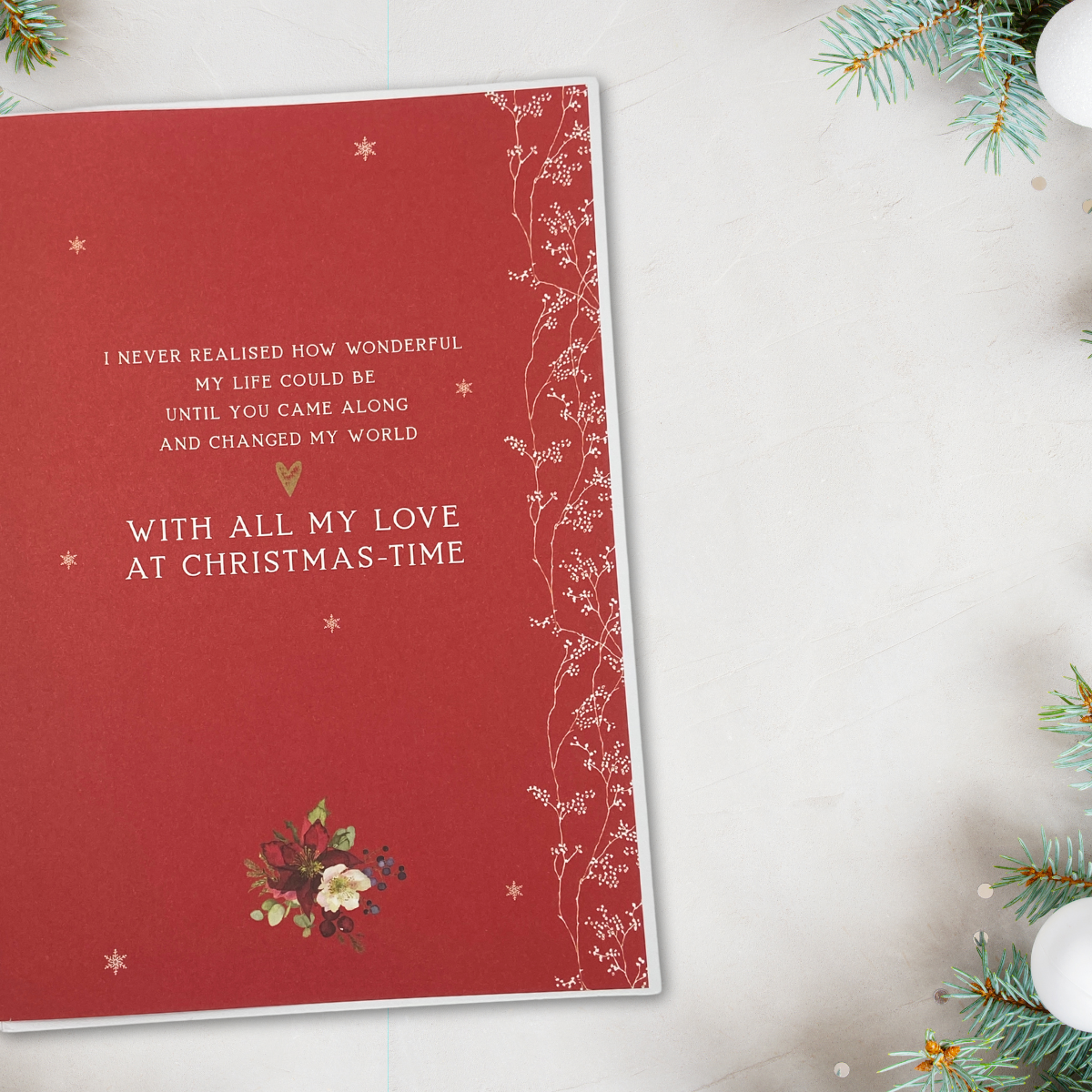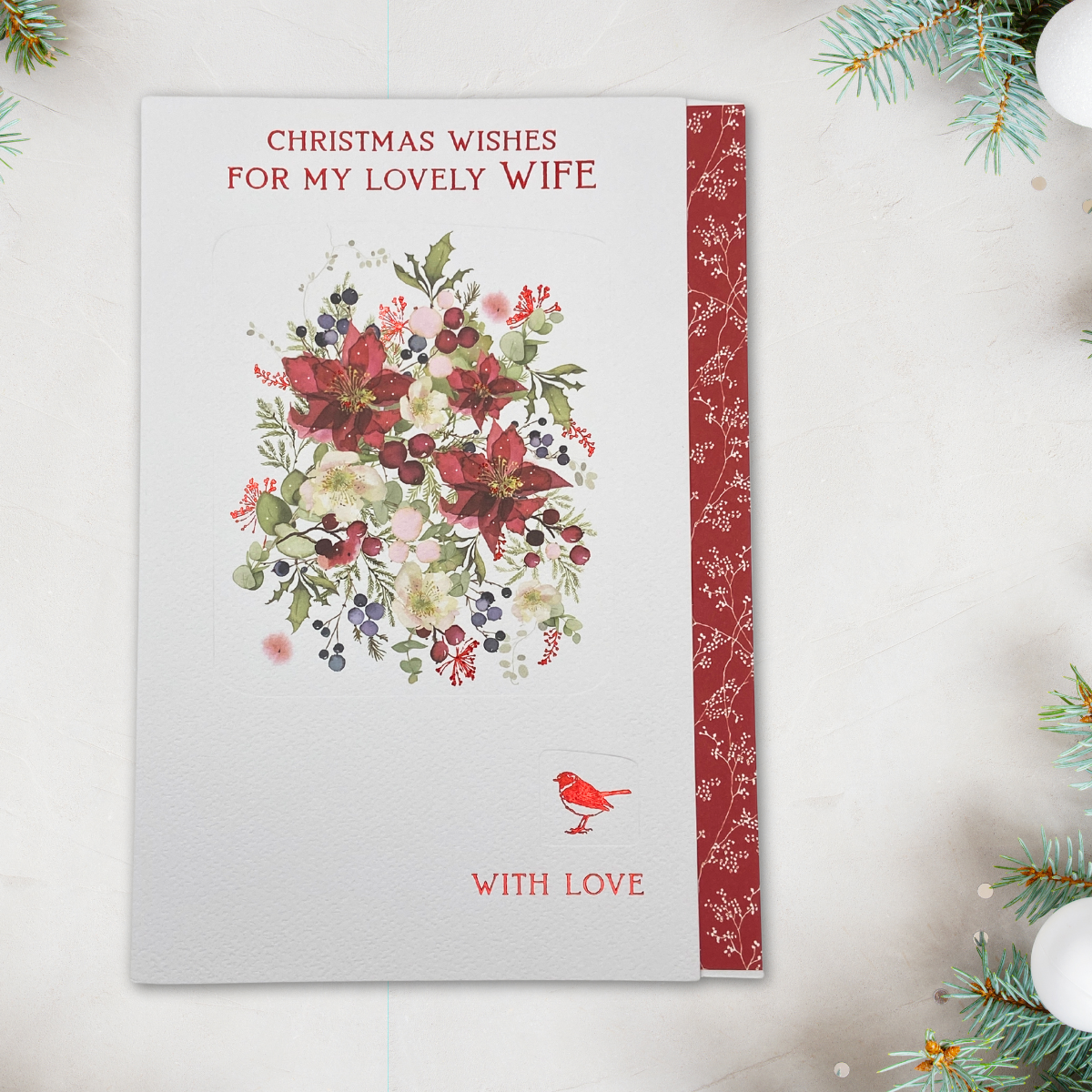 Fabulous full colour Wife Christmas card with embossed elements and red foil details. Finished with colour print inside.