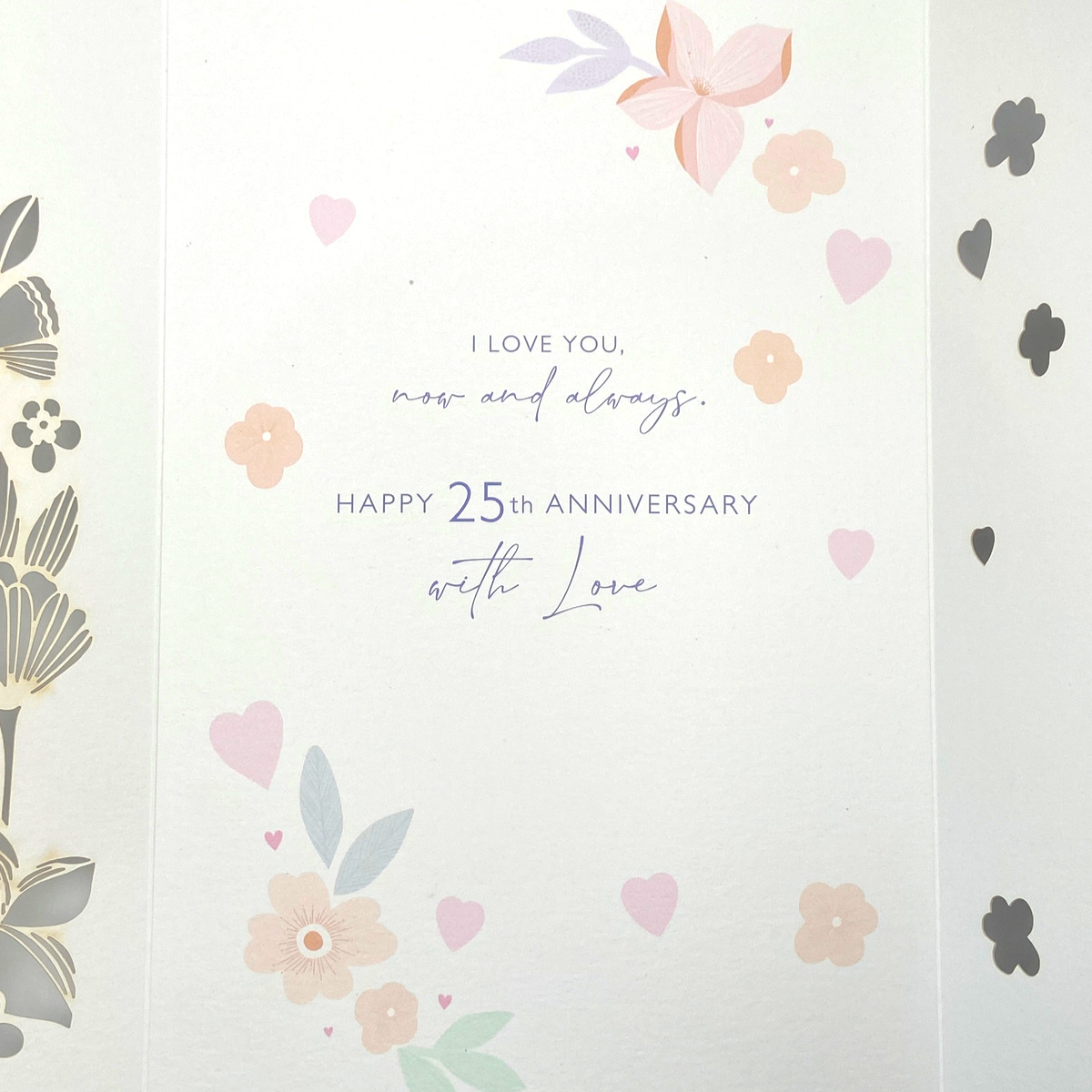 Stunning full colour 3-Fold Wife 25th Anniversary card complete with filigree cut-out flowers and butterflies! With rose gold foiled details and colour printed inside.